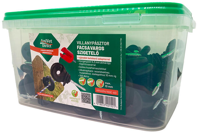 Erős, Facsavaros Ring Szigetelő – 100 db/doboz Ez a masszív, facsavaros ring szigetelő kiváló választás villanypásztor rendszerekhez, ahol fontos a stabil rögzítés és a hosszú élettartam. A fém menetes szár teljes egészében körbefut a gyűrű belsejében, így extra tartást és megbízhatóságot biztosít. Főbb jellemzők: ✅ Megbízható rögzítés: A teljesen körbefutó fém szár nagyobb szilárdságot nyújt, így ellenáll a terhelésnek és az időjárási hatásoknak. ✅ Fa oszlopokhoz ideális: Kifejezetten fakarókhoz, például akáchoz ajánlott. A könnyebb behajtás érdekében előfúrás javasolt. ✅ Gyors és egyszerű telepítés: A KR441363/011 betekerő adapterrel gyorsan és hatékonyan rögzíthető. ✅ Sokoldalú kompatibilitás: Nemcsak vezetékekhez, hanem maximum 10 mm széles szalagokhoz is használható, így rugalmas megoldást kínál különböző villanypásztor rendszerekhez. ✅ Gazdaságos kiszerelés: 100 db/doboz, amely nagyobb területekhez is elegendő mennyiséget biztosít. Ez a prémium minőségű szigetelő tökéletes választás azok számára, akik tartós és erős megoldást keresnek villanypásztor rendszerük kiépítéséhez.